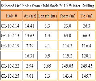 The Gold Rock Property is 800 meters northeast of the North Star Property. Selected Drill holes from Gold Rock 2010 Winter Drilling are listed in the Table on the right: