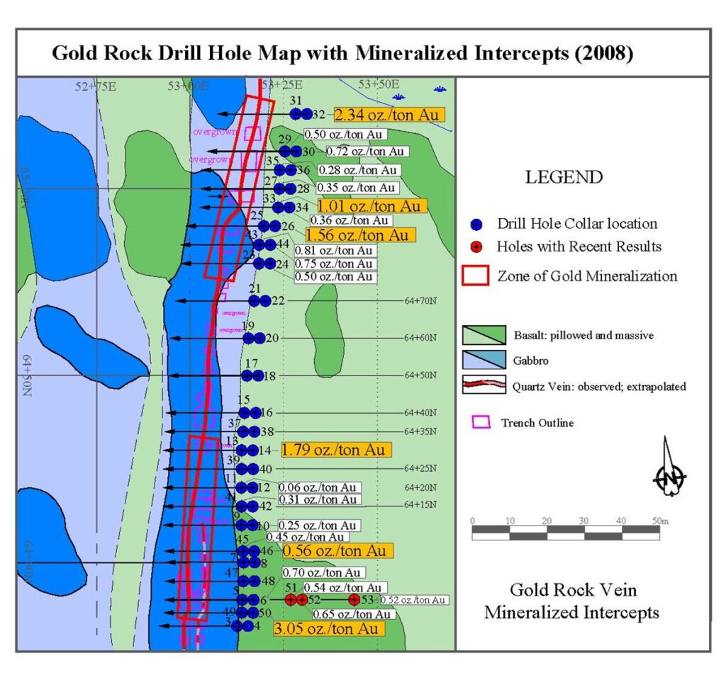 Drilling at Gold Rock, Drilled 79 HQ diamond drill holes, 2,873.7m. Several drill holes returned excellent gold intersections, such as: GR-08-06 24.14 g/t Au over 3.9m, GR-08-14 61.2 g/t Au over 1.8m, GR-08-30 24.6 g/t Au over 2.9m, GR-08-31 81.73 g/t Au over 1.6m, GR-08-43 27.85 g/t Au over 1.8m, GR-08-50 104.39 g/t Au over 3.4m, GR-08-52 22.42 g/t Au over 5.4m, GR-08-59 30.61 g/t Au over 2.4m, GR-08-78 25.54 g/t Au over 2.0m. (Voyageur Mineral Explorers Corp. (VOY) Press Release October 16, 2009).